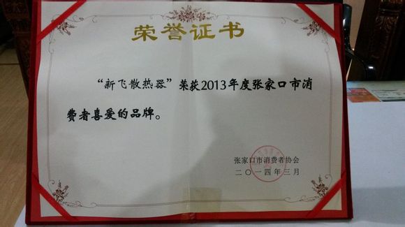 隨著新飛散熱器有限公司不斷發(fā)展與壯大,公司在央視廣告和各地不同形式廣告的大力投放,產(chǎn)品的不斷更新和質(zhì)量不斷提高,作為暖氣片十大品牌之一深受廣大消費者的喜愛和認可。特別是張家口市,3.15消費者協(xié)會在張家口市調(diào)查、評選,我們榮獲張家口市消費者喜愛和放心品牌。我們會秉承公司的理念,不斷向前飛躍,來回報廣大消費者。